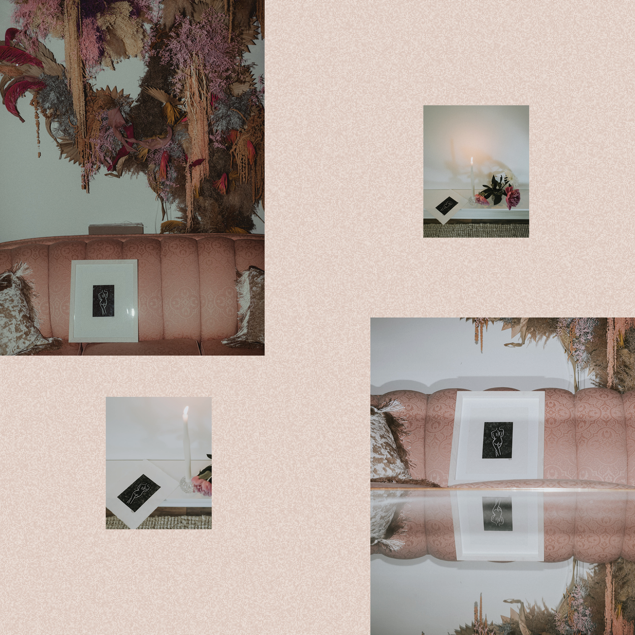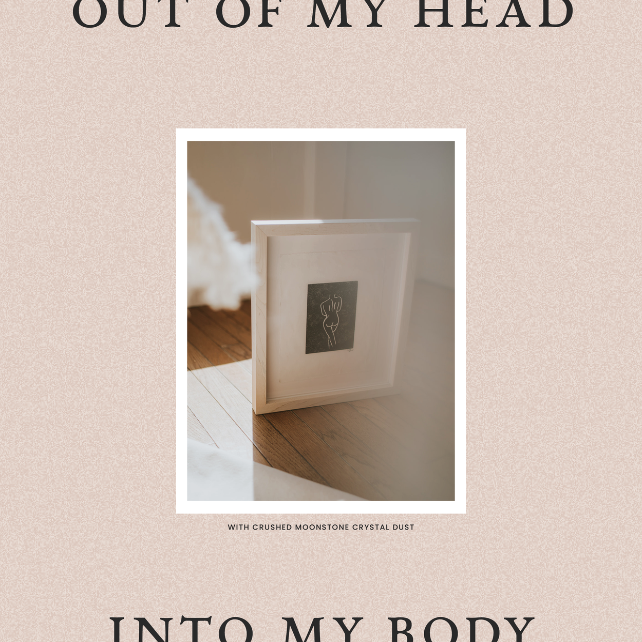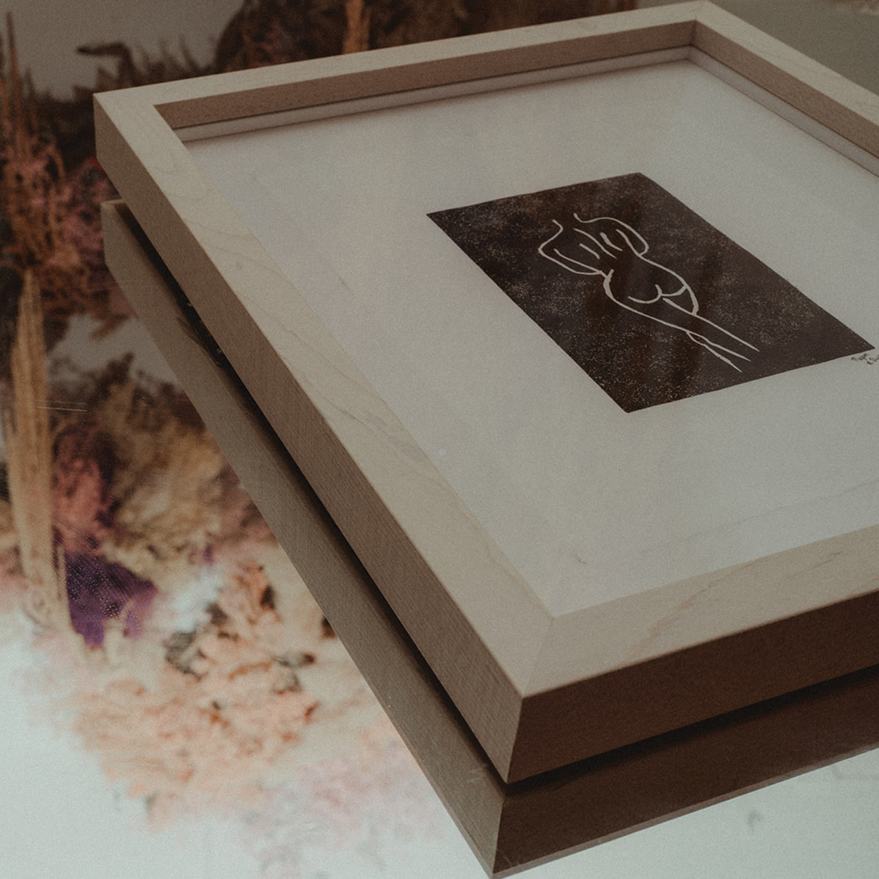 hand-carved + hand-printed woodcut print. megan's original design in black cosmos with genuine crushed moonstone crystals. printed on hand-ripped mulberry + bamboo fiber paper. choose unframed or professionally framed in bleached maple with a flout-mount finish.