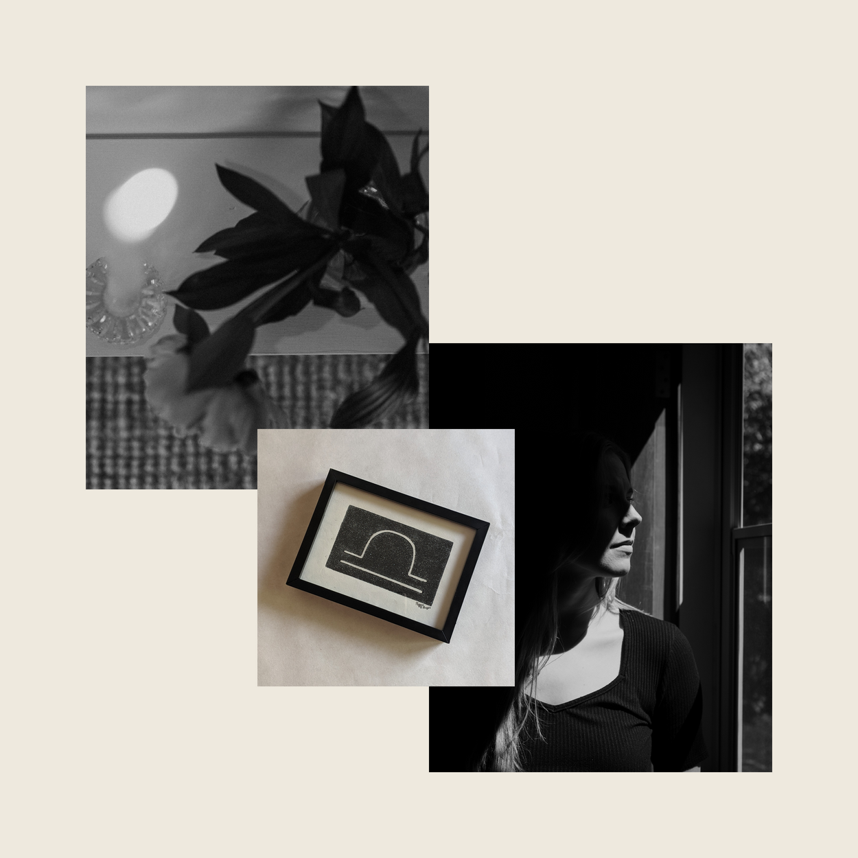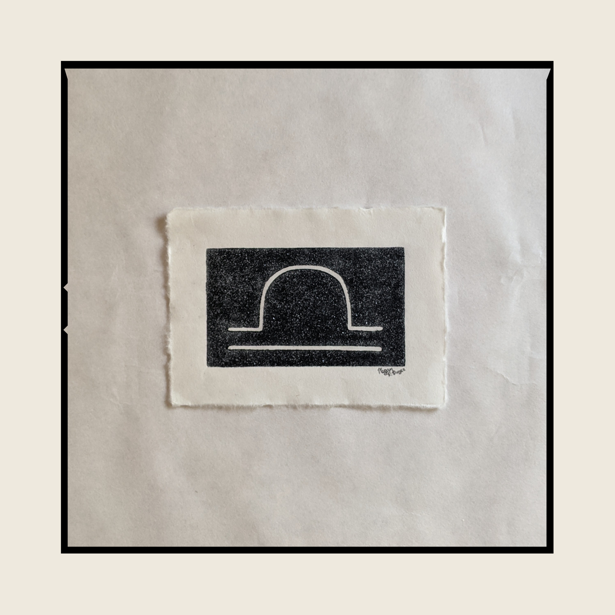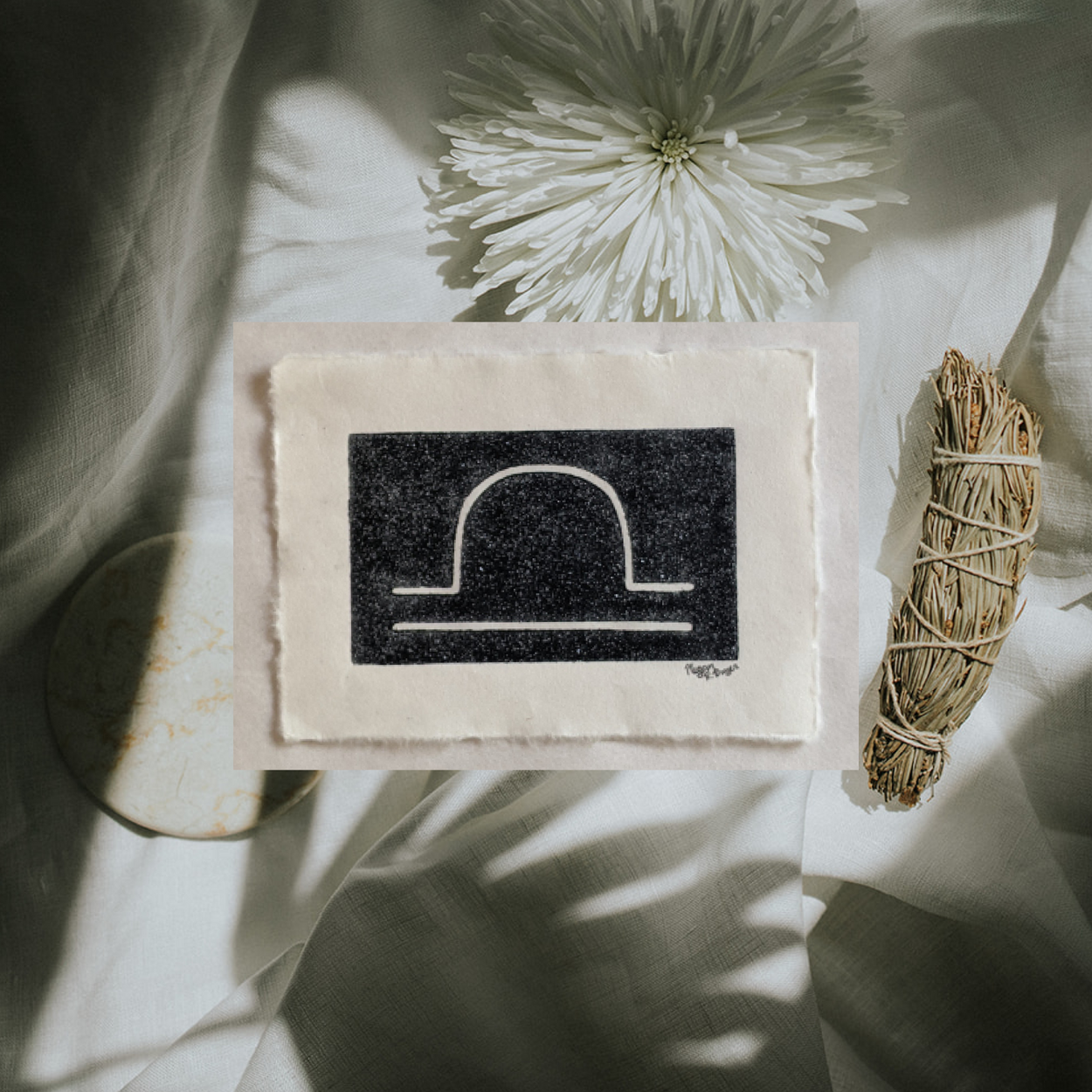 hand-carved + hand-printed woodcut print in black cosmos with genuine crushed moonstone crystals. printed on hand-ripped mulberry + bamboo fiber paper.