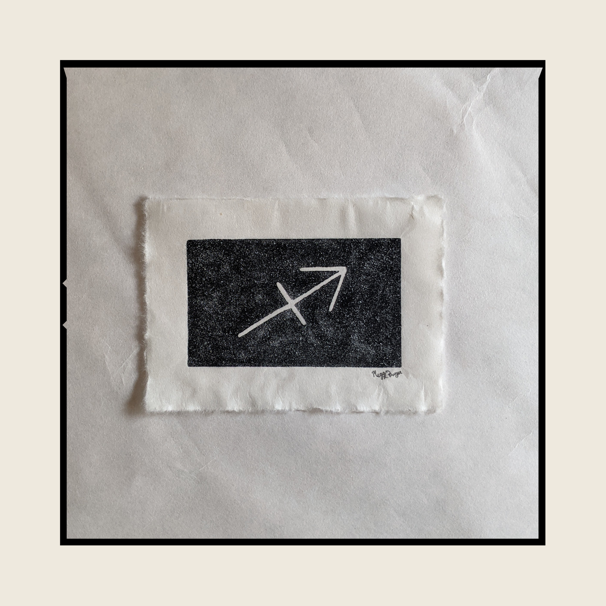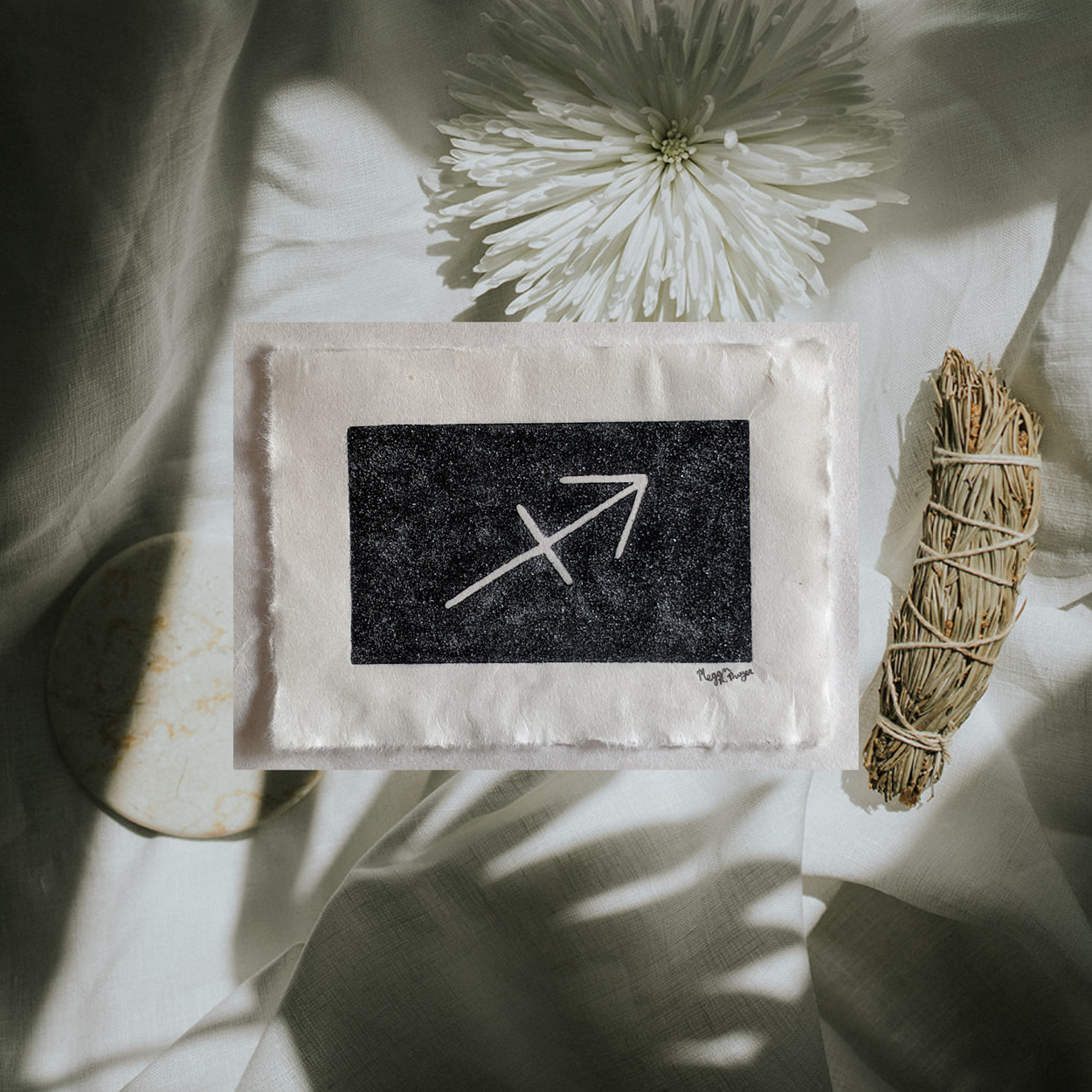 hand-carved + hand-printed woodcut print in black cosmos with genuine crushed moonstone crystals. printed on hand-ripped mulberry + bamboo fiber paper.
