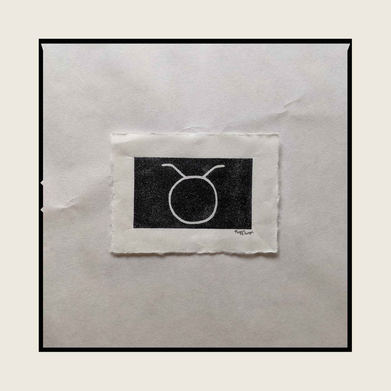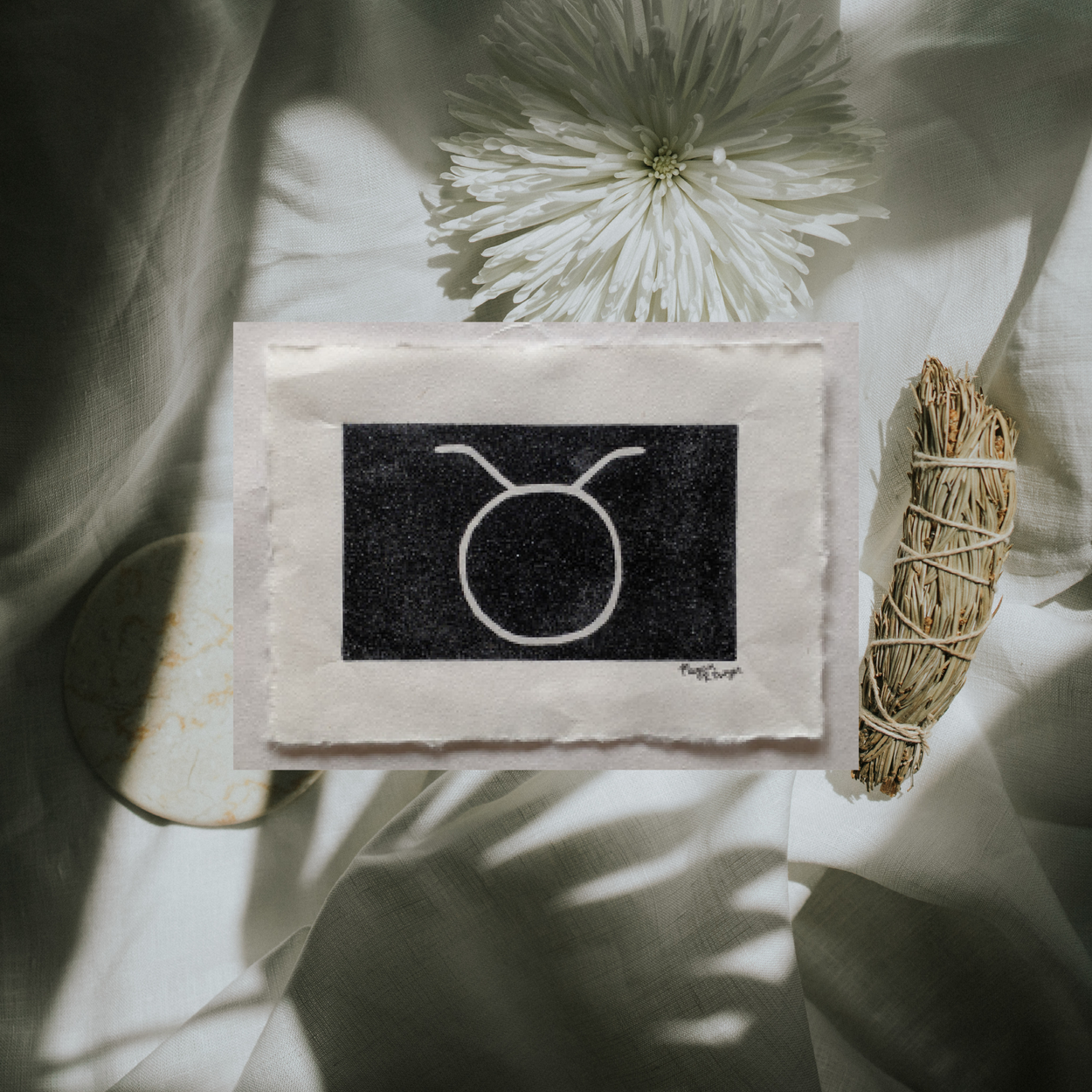 hand-carved + hand-printed woodcut print in black cosmos with genuine crushed moonstone crystals. printed on hand-ripped mulberry + bamboo fiber paper.